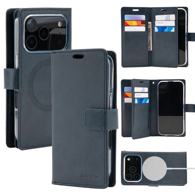 Goospery - iPhone 17 Pro Hülle - Leder Bookcover - Bluemoon Diary MagSafe Series - navy