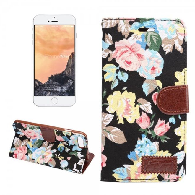 Cover für iPhone 8 Plus / 7 Plus - Handy Hülle aus Leder - mit Stofftextur und Blumenmuster - schwarz