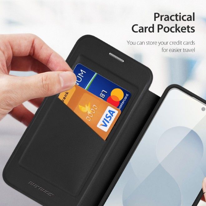Diese Samsung Galaxy S26 Hülle aus der Skin X Pro Series von Dux Ducis mit gehärteter Polycarbonat Rückseite, weichem TPU-Gummi-Rand und eleganter Kunstleder Displayklappe verleiht deinem Samsung Galaxy S26 nicht nur ein angesagtes Design, sondern bietet deinem Smartphone auch einen optimalen Schutz vor Kratzern, Schmutz und Staub sowie vor dem alltäglichen Verschleiss. Zudem ist die Schutzhülle Apple MagSafe kompatibel.
