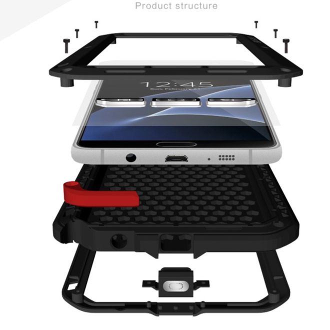 Für das Samsung Galaxy S7 gibt es kaum eine robustere Handyhülle als diese Samsung Galaxy S7 Hülle in schwarz. Der Metallrahmen ist mit Schrauben fixiert und bietet militärische Qualität vor unerwarteten Stürzen. Extrem stark und extrem einfach zu montieren. Die abgeschrägten Ecken dieser Samsung Galaxy S7 Handyhülle zeichnen einen futuristischen Charakter. Pack dein Samsung Galaxy S7 in dieses kraftvolle Gehäuse und profitiere von einem tierisch starken Schutz.
