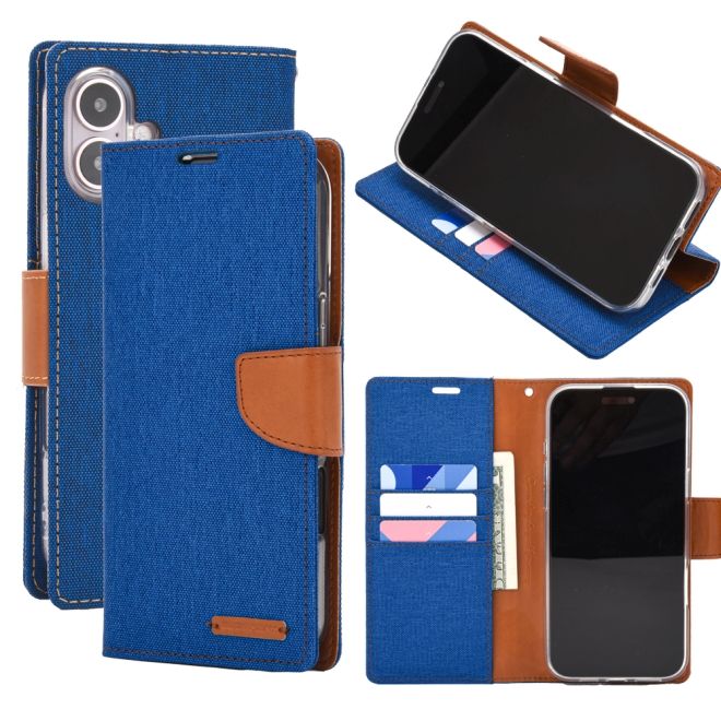 Goospery - iPhone 16 Plus Hülle - Bookcover - Canvas Diary Series - blau/camel