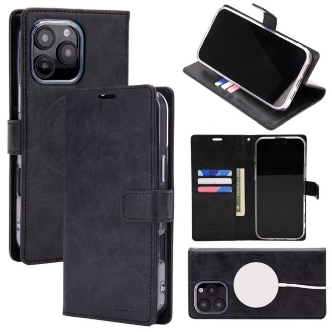 Goospery - iPhone 16 Pro Max Hülle - Leder Bookcover - Bluemoon Diary MagSafe Series - schwarz