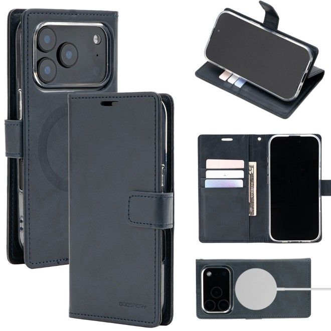 Goospery - iPhone 17 Pro Hülle - Leder Bookcover - Bluemoon Diary MagSafe Series - navy