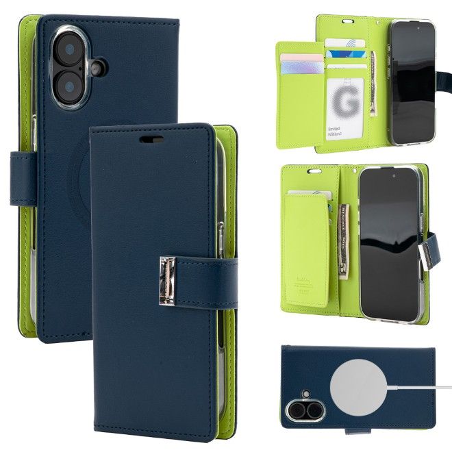 Goospery - iPhone 17 Hülle - Leder Bookcover - Rich Diary MagSafe Series - navy/lime