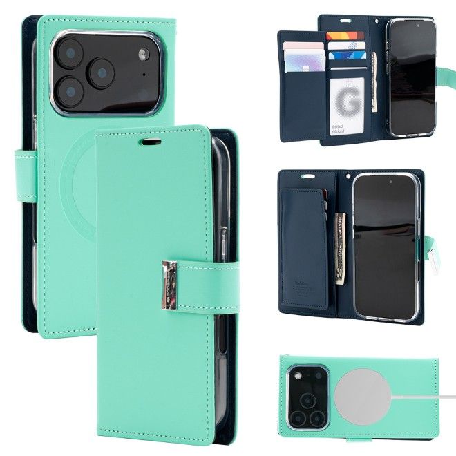 Goospery - iPhone 17 Pro Hülle - Leder Bookcover - Rich Diary MagSafe Series - mint/navy