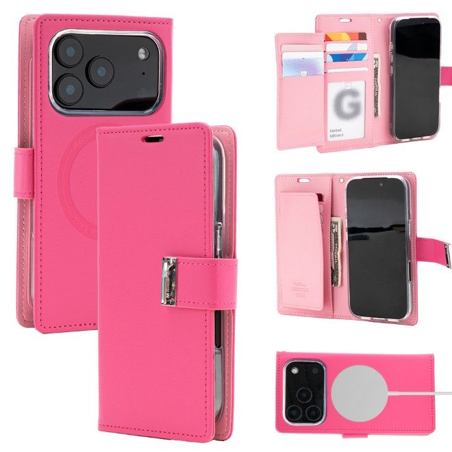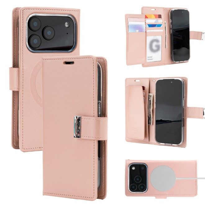 Goospery - iPhone 17 Pro Hülle - Leder Bookcover - Rich Diary MagSafe Series - rosa/pink