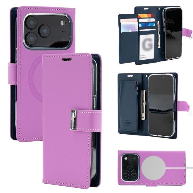 Goospery - iPhone 17 Pro Hülle - Leder Bookcover - Rich Diary MagSafe Series - purpur/navy