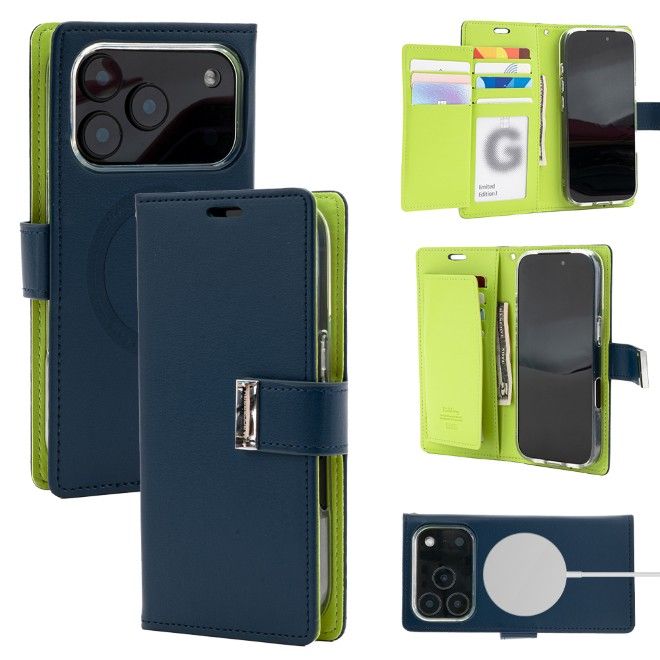 Goospery - iPhone 17 Pro Hülle - Leder Bookcover - Rich Diary MagSafe Series - navy/lime