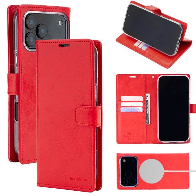 Goospery - iPhone 17 Pro Max Hülle - Leder Bookcover - Bluemoon Diary MagSafe Series - rot