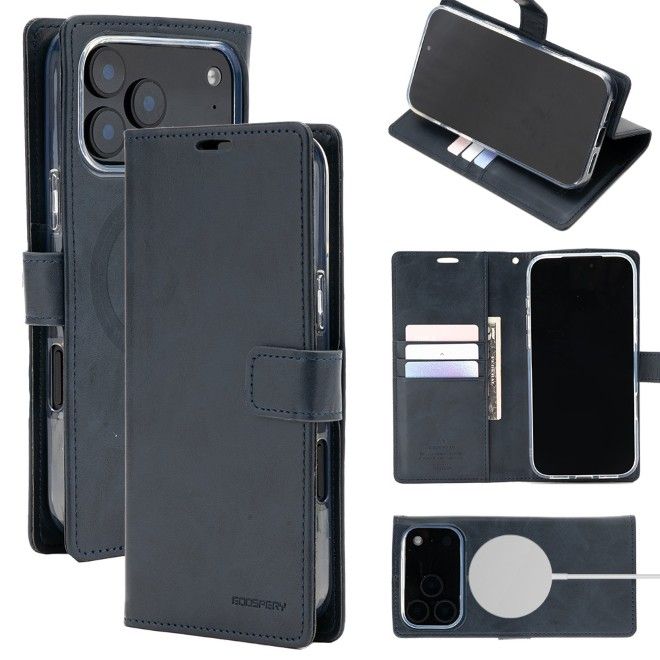 Goospery - iPhone 17 Pro Max Hülle - Leder Bookcover - Bluemoon Diary MagSafe Series - navy