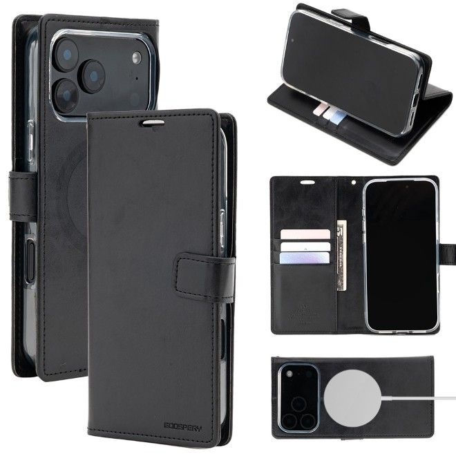 Goospery - iPhone 17 Pro Max Hülle - Leder Bookcover - Bluemoon Diary MagSafe Series - schwarz