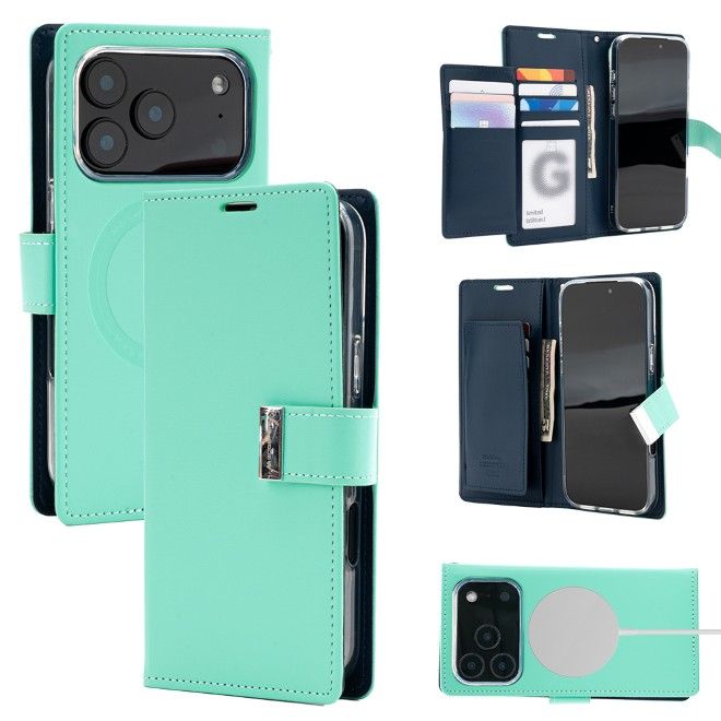 Goospery - iPhone 17 Pro Max Hülle - Leder Bookcover - Rich Diary MagSafe Series - mint/navy