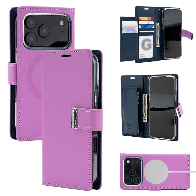 Goospery - iPhone 17 Pro Max Hülle - Leder Bookcover - Rich Diary MagSafe Series - purpur/navy