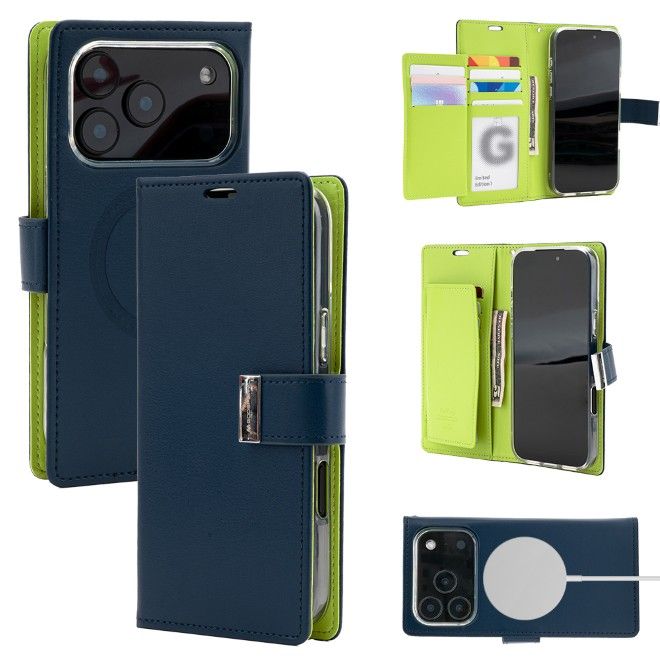 Goospery - iPhone 17 Pro Max Hülle - Leder Bookcover - Rich Diary MagSafe Series - navy/lime