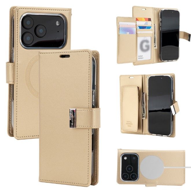 Goospery - iPhone 17 Pro Max Hülle - Leder Bookcover - Rich Diary MagSafe Series - gold
