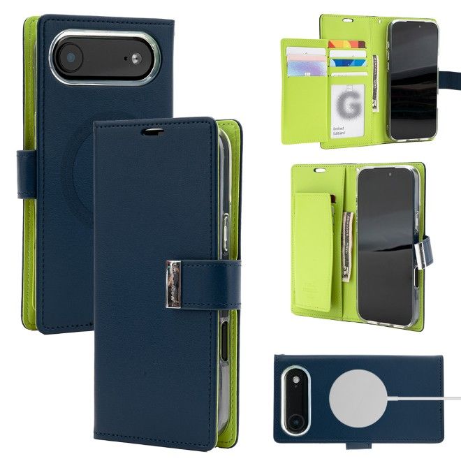 Goospery - iPhone Air Hülle - Leder Bookcover - Rich Diary MagSafe Series - navy/lime
