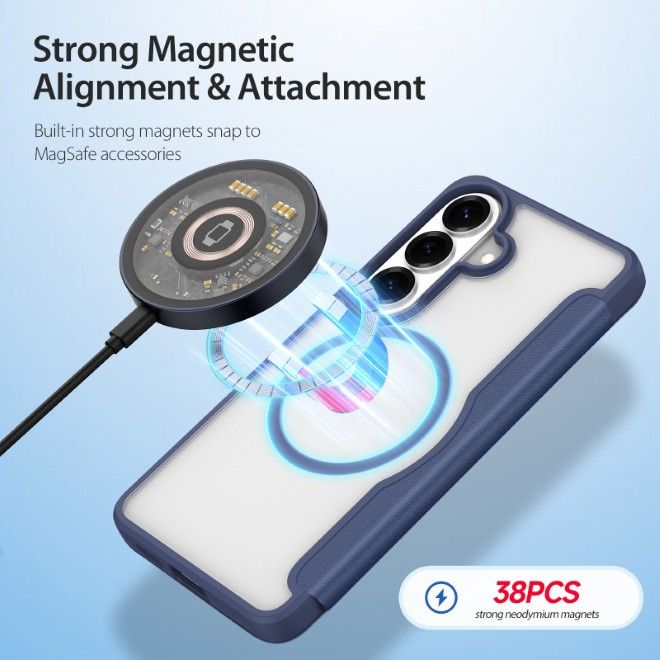 Diese Samsung Galaxy S26+ Hülle aus der Skin X Pro Series von Dux Ducis mit gehärteter Polycarbonat Rückseite, weichem TPU-Gummi-Rand und eleganter Kunstleder Displayklappe verleiht deinem Samsung Galaxy S26+ nicht nur ein angesagtes Design, sondern bietet deinem Smartphone auch einen optimalen Schutz vor Kratzern, Schmutz und Staub sowie vor dem alltäglichen Verschleiss. Zudem ist die Schutzhülle Apple MagSafe kompatibel.