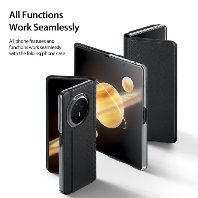 Das Telefonscharnier ist abgedeckt und im zusammengeklappten Zustand gut geschützt, erhöhte Kanten schützen die Kamera und den Bildschirm, alle Telefonfunktionen funktionieren nahtlos mit dieser faltbaren Telefonhülle für dein Honor Magic V3.