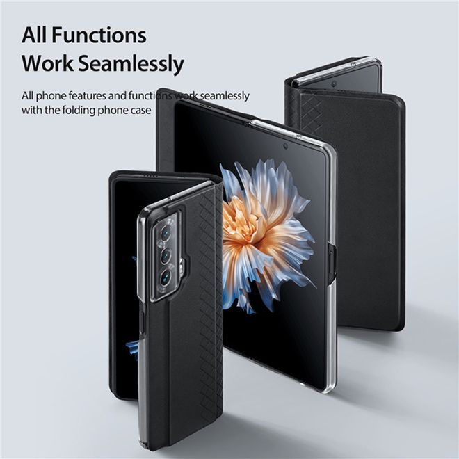 Das Telefonscharnier ist abgedeckt und im zusammengeklappten Zustand gut geschützt, erhöhte Kanten schützen die Kamera und den Bildschirm, alle Telefonfunktionen funktionieren nahtlos mit dieser faltbaren Telefonhülle für dein Honor Magic Vs.
