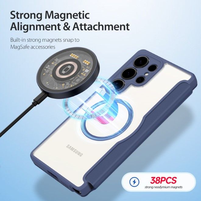 Diese Galaxy S25 Ultra Hülle aus der Skin X Pro Series von Dux Ducis mit gehärteter Polycarbonat Rückseite, weichem TPU-Gummi-Rand und eleganter Kunstleder Displayklappe verleiht deinem Galaxy S25 Ultra nicht nur ein angesagtes Design, sondern bietet deinem Smartphone auch einen optimalen Schutz vor Kratzern, Schmutz und Staub sowie vor dem alltäglichen Verschleiss. Zudem ist die Schutzhülle Apple MagSafe kompatibel.