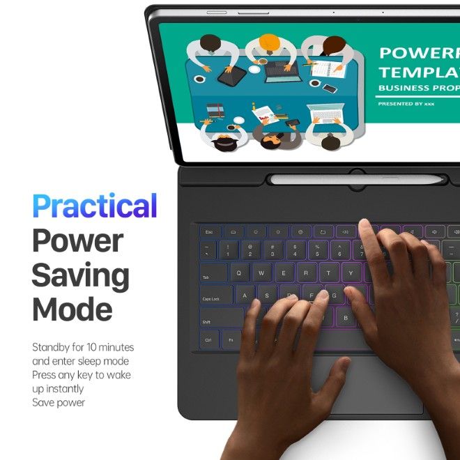 Die Tastatur lässt sich über den USB-C Port aufladen und verfügt über einen 1200mAh integrierten Akku. Verbinde dein Samsung Galaxy Tab S10 FE+ per Bluetooth mit der Tastatur und schon kannst du lostippen. Die Aufstellfunktion lässt dein Samsung Galaxy Tab S10 FE+ wie ein Laptop aussehen und dank diversen einstellbaren Betrachtungswinkel ist ein ergonomisches Arbeiten garantiert.