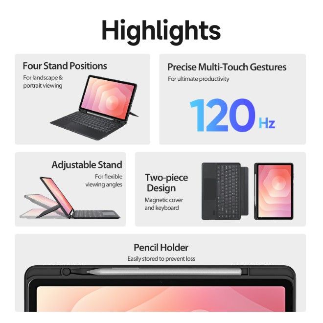 Kopple dein Samsung Galaxy Tab S11 über Bluetooth mit der Tastatur, und die Tastatur kann, vollgeladen (lädt in 2-3 Stunden auf 100%), 120 Tage im Standby und ca. 80 Stunden lang aktiv eingesetzt werden.