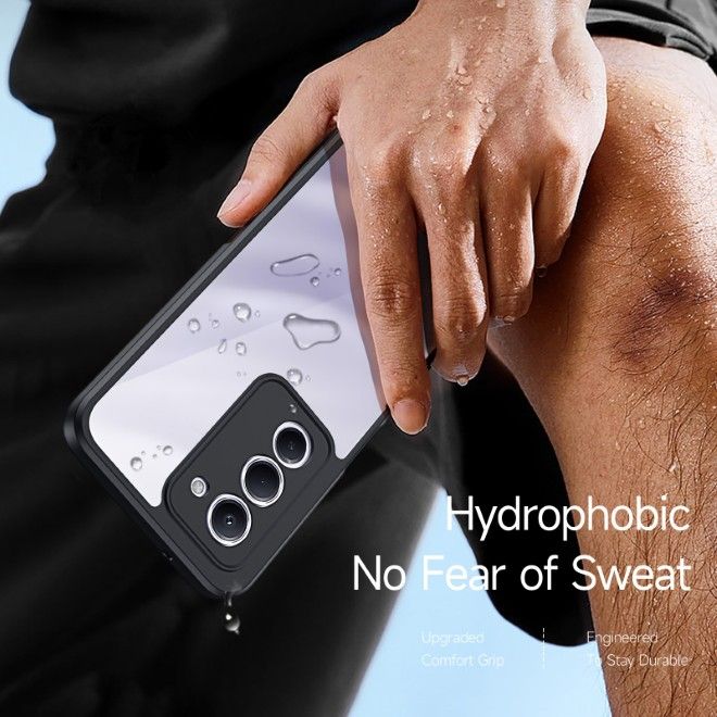 Die Schutzhülle besteht aus einer gehärteten Polycarbonat Rückseite und verfügt über einen weichen TPU-Gummi Rand.