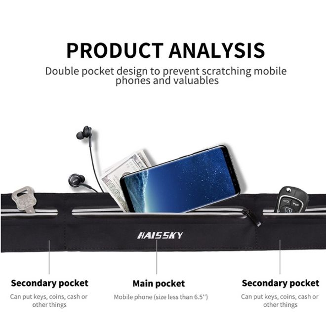 Laufgürtel für Handys bis 6.5“ - Running Belt mit 3 Reissverschlussfächern - Universalgrösse - schwarz
