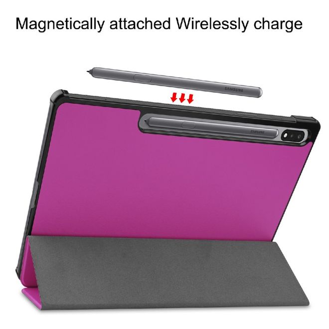 Mit dieser dreifach faltbaren Samsung Galaxy Tab S7 FE Hülle in purpur bist du bestens gewappnet - auch für unterwegs